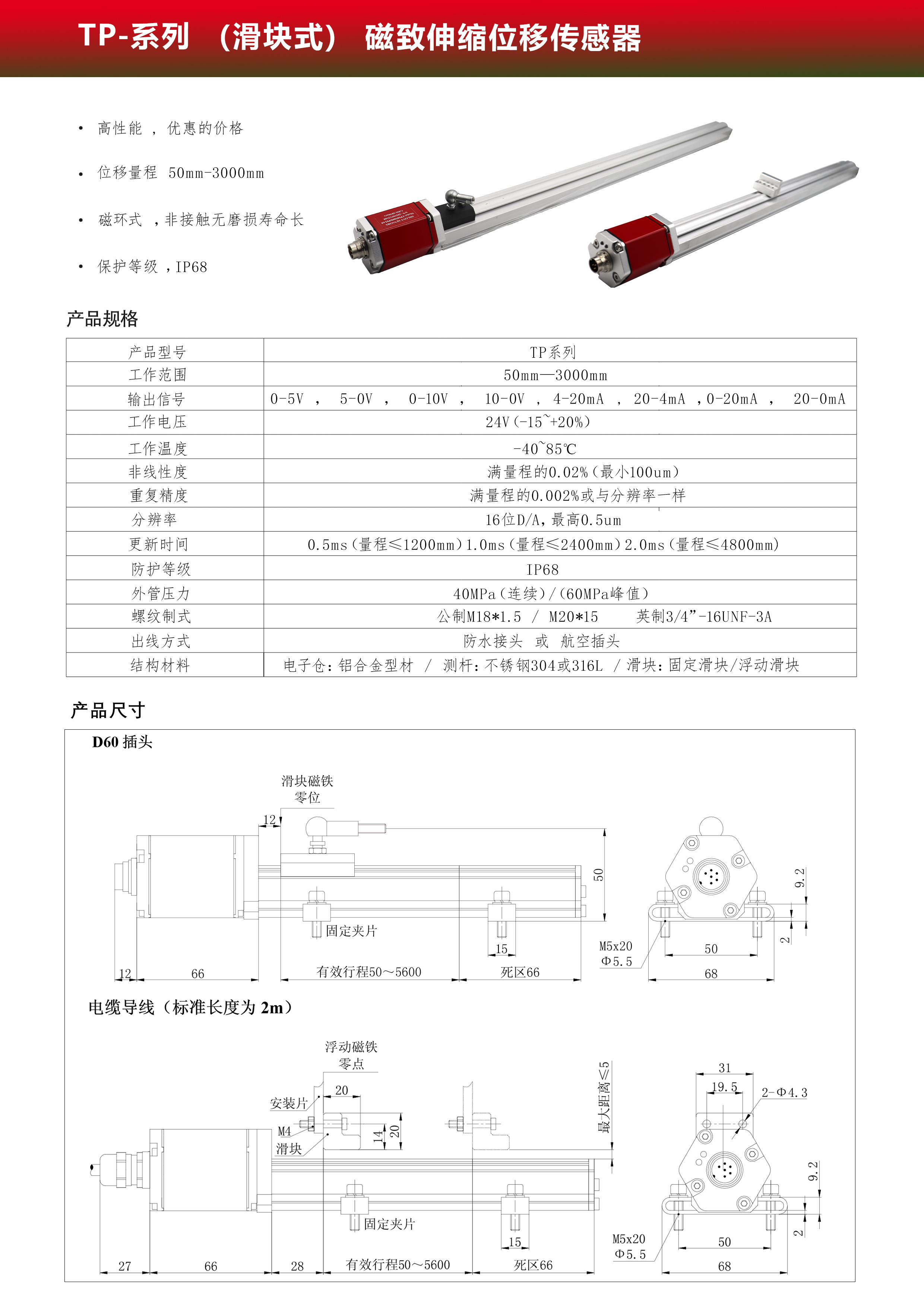 磁致伸縮位移(液位)傳感器,是利用磁致伸縮原理、通過兩個不同磁場相交產(chǎn)生一個應(yīng)變脈沖信號來準(zhǔn)確地測量位置的。測量元件是一根波導(dǎo)管,波導(dǎo)管內(nèi)的敏感元件由特殊的磁致伸縮材料制成的。測量過程是由傳感器的電子室內(nèi)產(chǎn)生電流脈沖,該電流脈沖在波導(dǎo)管內(nèi)傳輸,從而在波導(dǎo)管外產(chǎn)生一個圓周磁場,當(dāng)該磁場和套在波導(dǎo)管上作為位置變化的活動磁環(huán)產(chǎn)生的磁場相交時,由于磁致伸縮的作用,波導(dǎo)管內(nèi)會產(chǎn)生一個應(yīng)變機(jī)械波脈沖信號,這個應(yīng)變機(jī)械波脈沖信號以固定的聲音速度傳輸,并很快被電子室所檢測到。