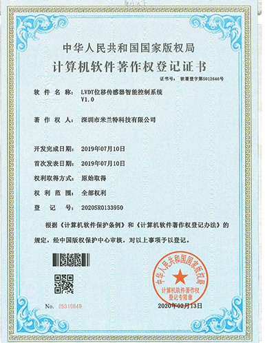米蘭特LVDT位移傳感器智能控制系統V1.0軟件著作權登記證書