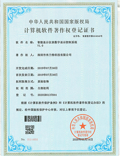 米蘭特智能顯示儀表數字顯示控制系統V1.0軟件著作權登記證書